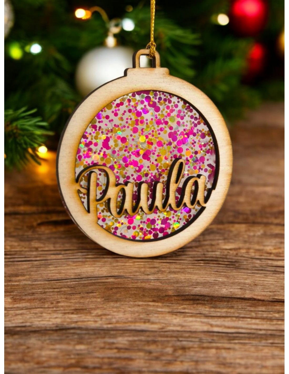 Esta bola de Navidad de madera personalizada con nombre, y adornada con confeti es el detalle original que hará que tu árbol sea especial estas Navidades.