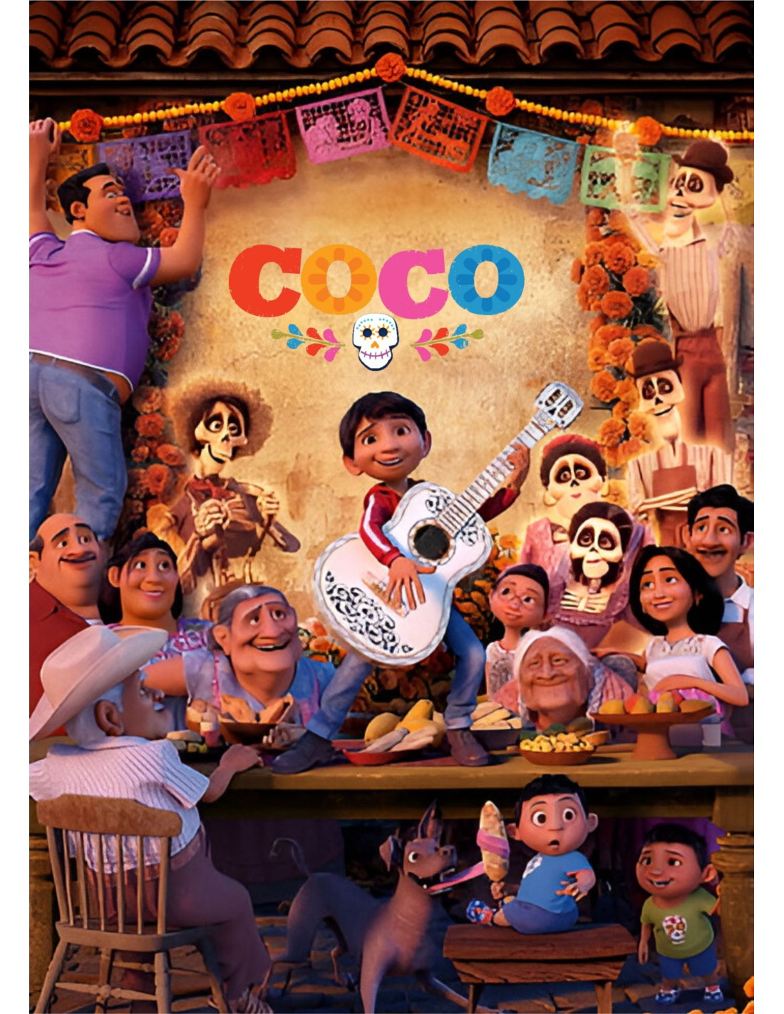 Hoja de papel de azúcar o chocotransfer impresa con tinta comestible para decorar tartas con los personajes de la película de Disney Coco.