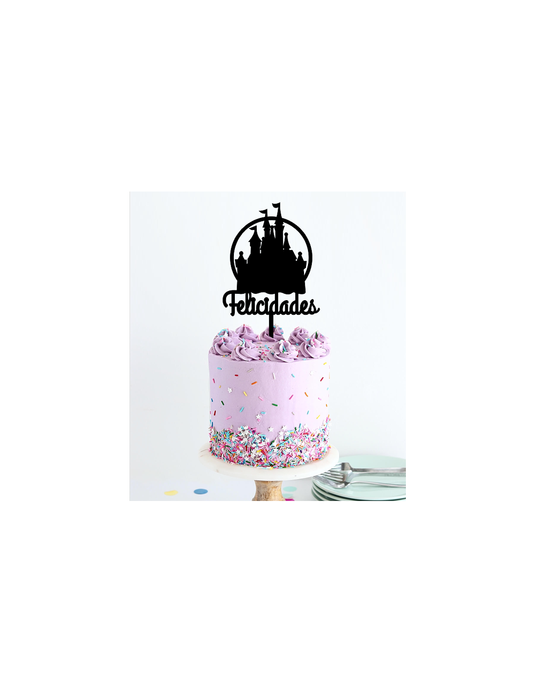 Topper Castillo Disney, fabricado en acrílico de 3 milímetros de grosor o madera DM. Elige el color que más te guste entre los disponibles, y haz que tu tarta sea de lo más especial y bonita.