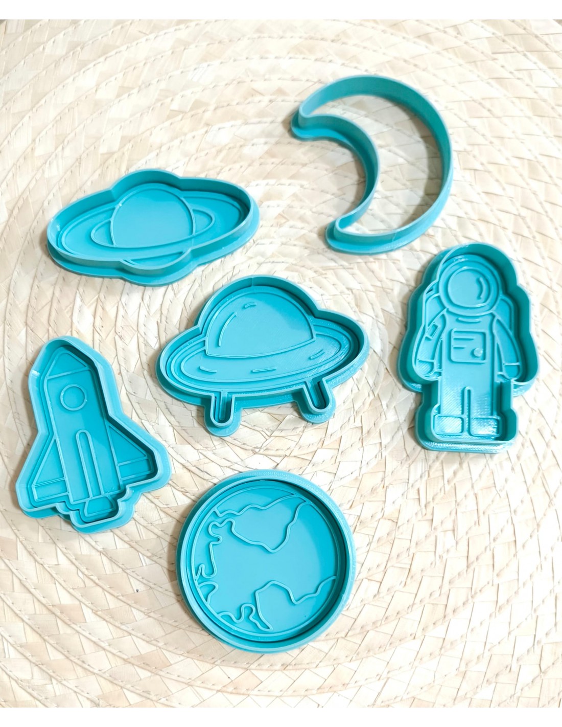 Contiene 6 cortadores + 5 marcadores (media luna, astronauta, nave espacial, cohete, planeta, planeta Tierra).