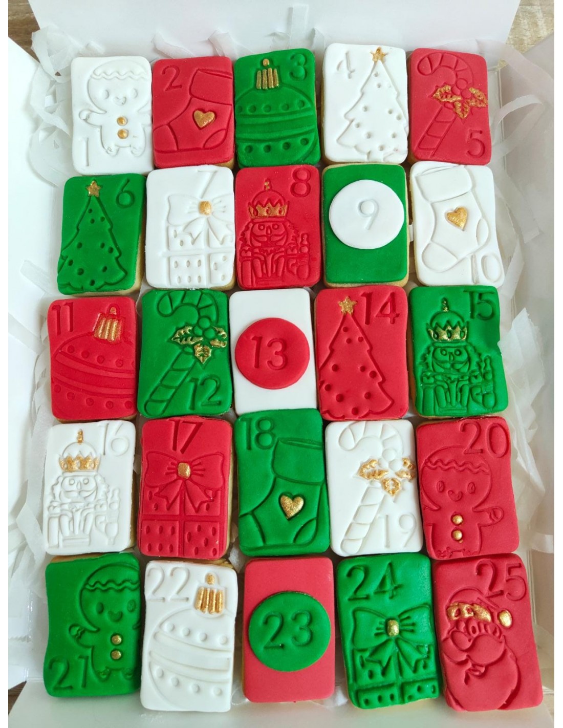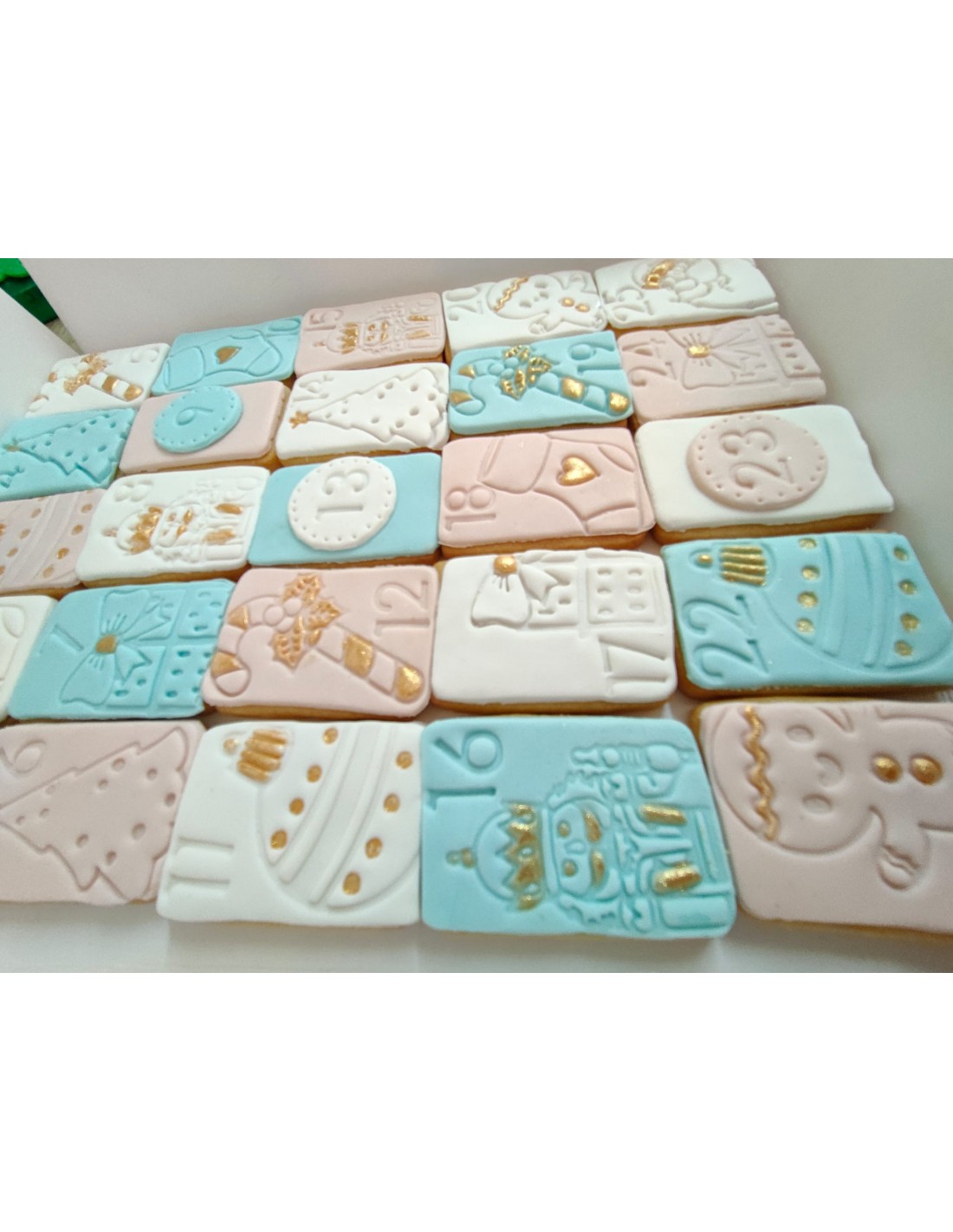 Este set está pensado para decorar un delicioso y original calendario de adviento. Con el cortador rectangular podrás cortar tus galletas y con el resto de marcadores decorarlas como más te guste, marcando la galleta o el fondant, obteniendo unos resultados de lo más bonitos. También incluye números para poner el día en cada galleta.
