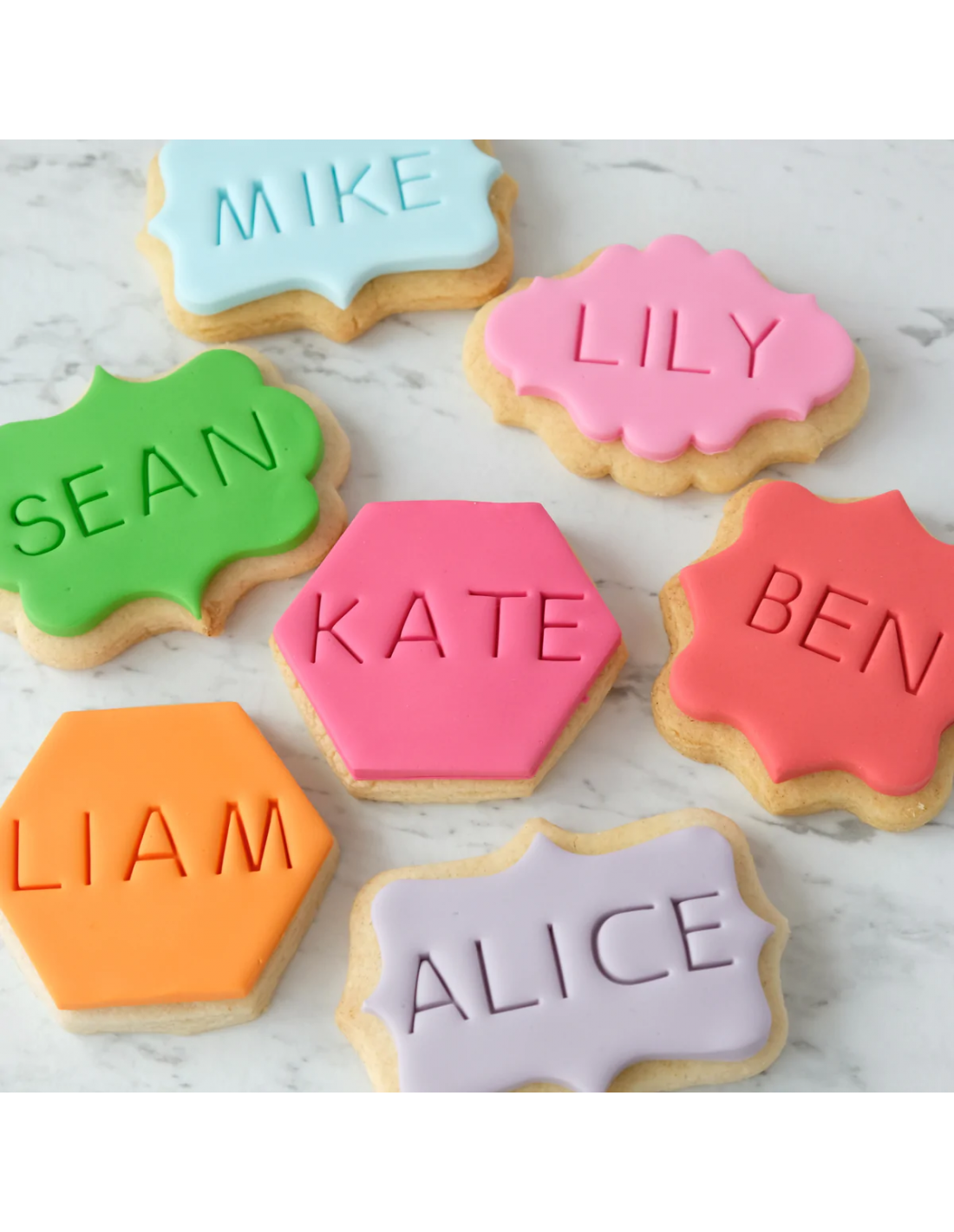 Con este original estampador de letras tipo imprenta en mayúsculas de tamaño grandes puedes estampar galletas, fondant o mazapán con su propio texto. Contiene letras mayúsculas, símbolos y un práctico soporte.