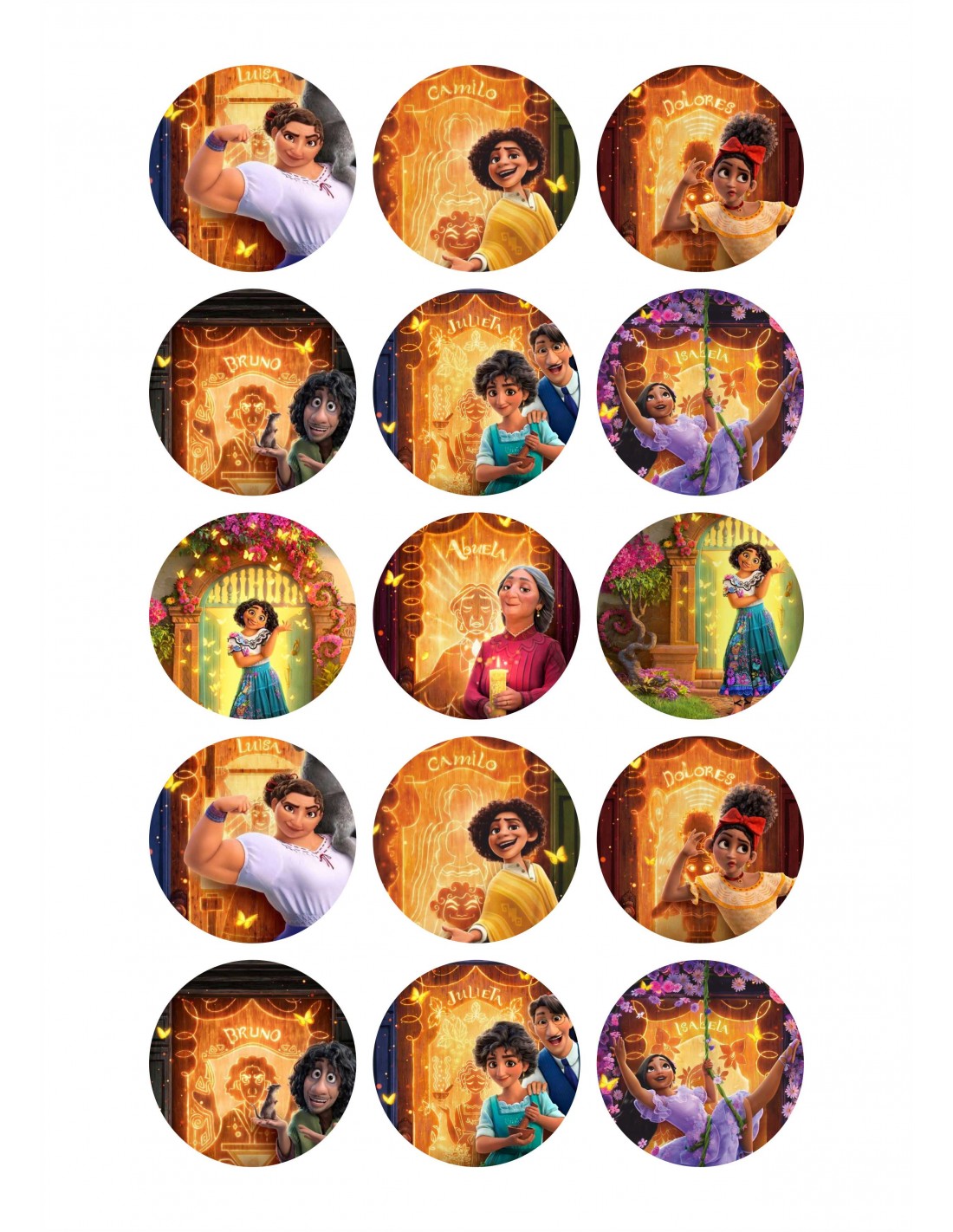 Hoja de papel de azúcar o chocotransfer impresa con tinta comestible para tartas con temática de Encanto, la película de Disney para galletas o cupcakes.