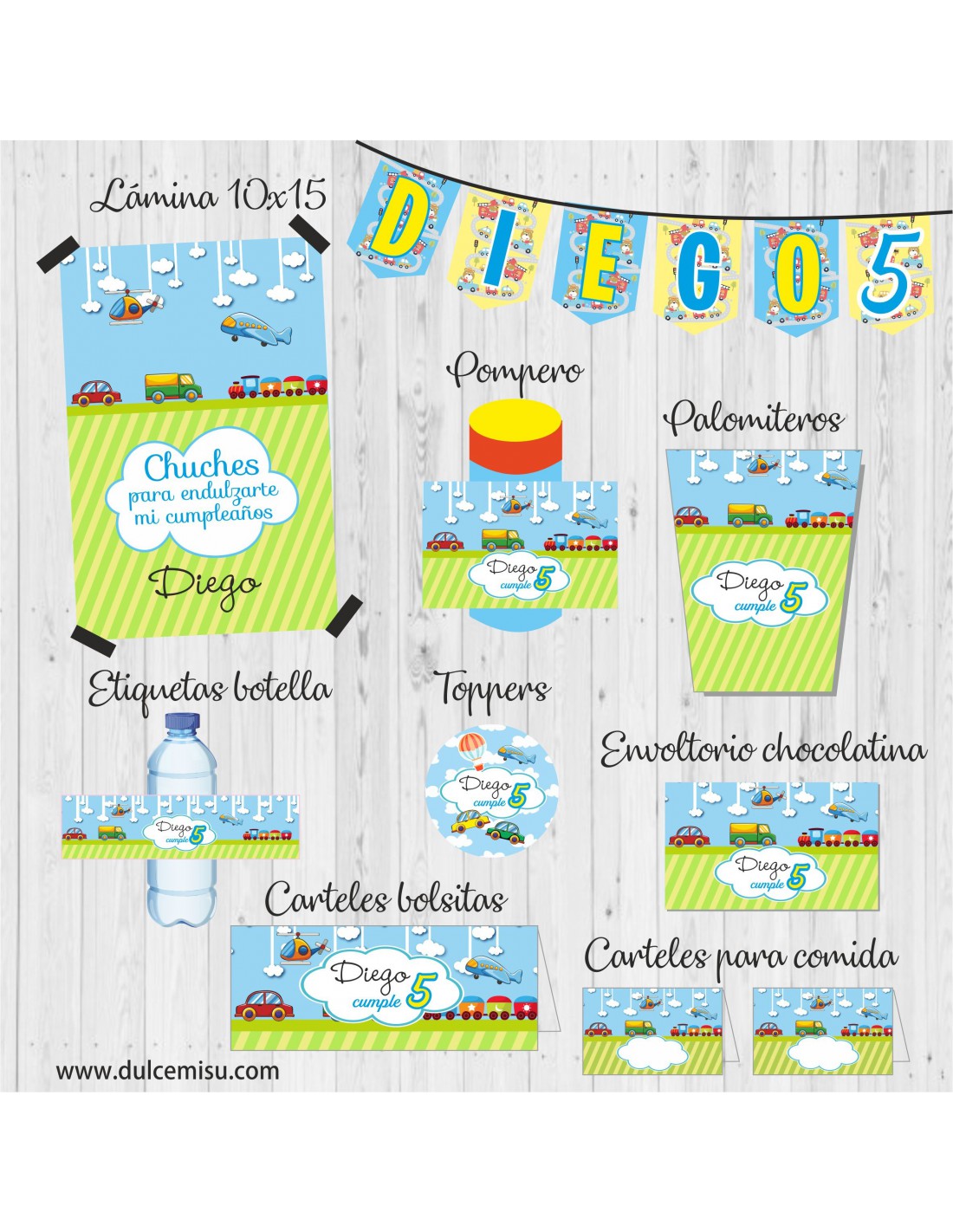 Kit de fiesta personalizado con divertida temática de Coches ideal para decorar fiestas de cumpleaños temáticas y mesas dulces.