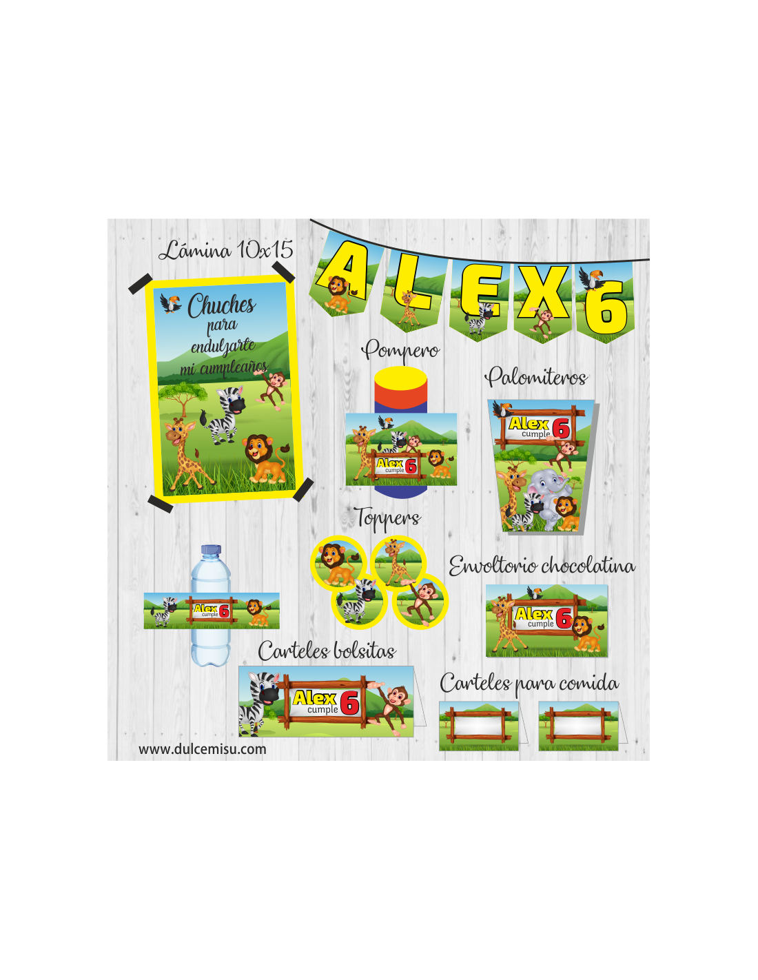 Kit de fiesta personalizado con divertida temática de Animales safari ideal para decorar fiestas de cumpleaños temáticas y mesas dulces.