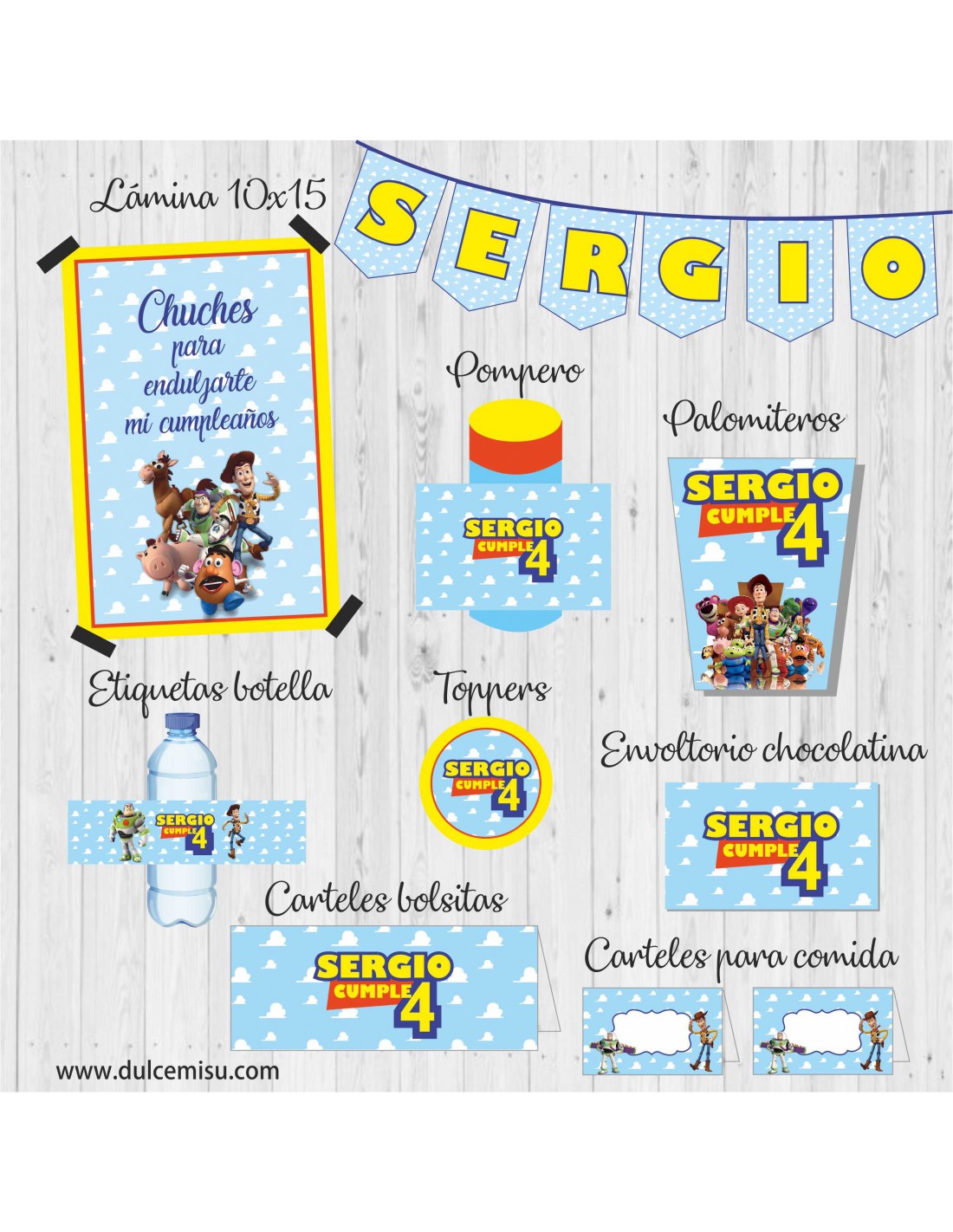 Kit de fiesta personalizado con divertida temática de Toy Story ideal para decorar fiestas de cumpleaños temáticas y mesas dulces.