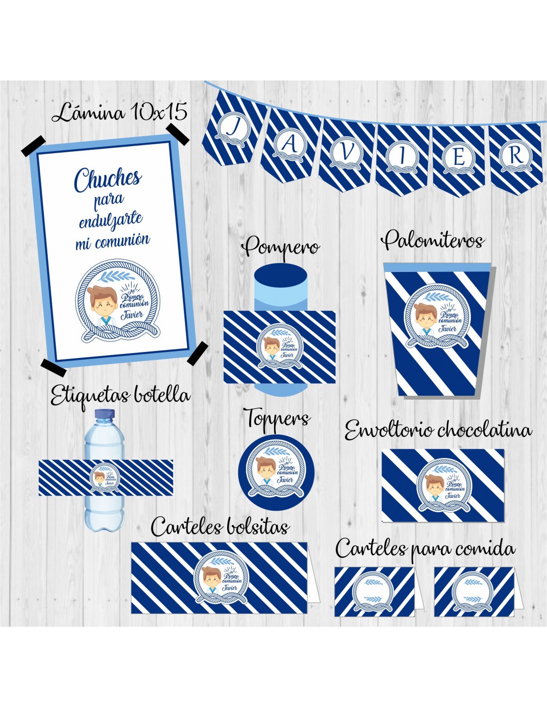 Kit de fiesta personalizado con bonito diseño de Comunión Marinero ideal para decorar fiestas de comunión y mesas dulces.