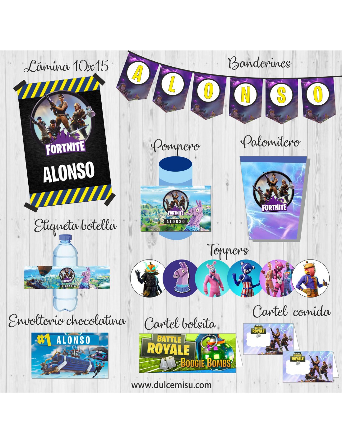 Kit de fiesta personalizado con divertida temática de Fortnite ideal para decorar fiestas de cumpleaños temáticas y mesas dulces.
