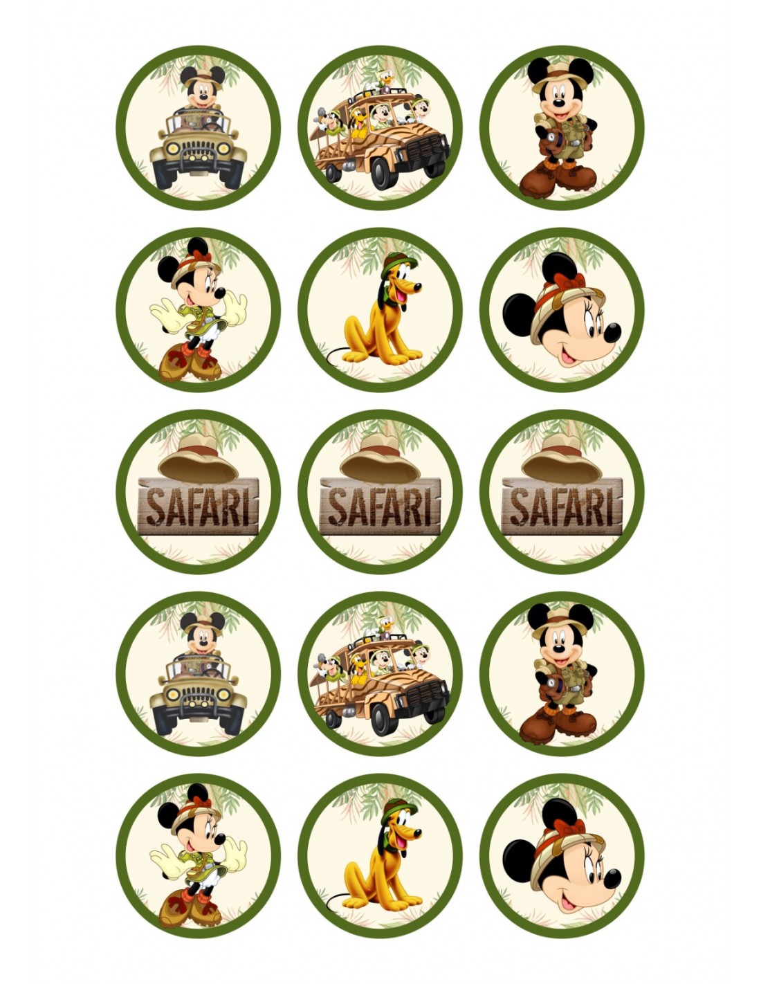 Hoja de papel de azúcar o chocotransfer impresa con tinta comestible para decorar galletas con imágenes de Mickey Safari .