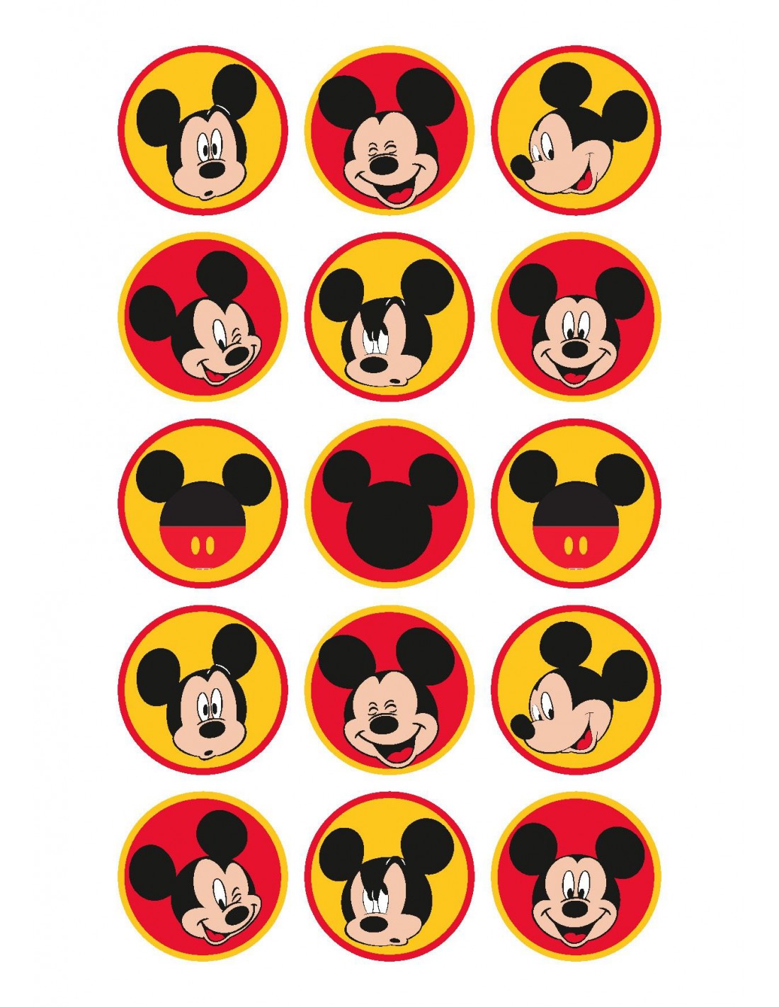 Hoja de papel de azúcar o chocotransfer impreso con tinta comestible para decorar galletas o cupcakes con Mickey Mouse.