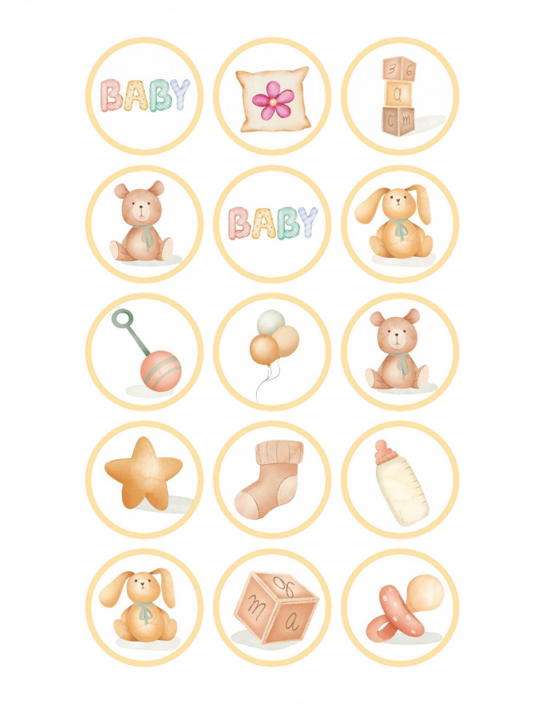 Hoja de papel de azúcar o chocotranfer impresa con tinta comestible para decorar galletas personalizadas con dibujos de Bebé.