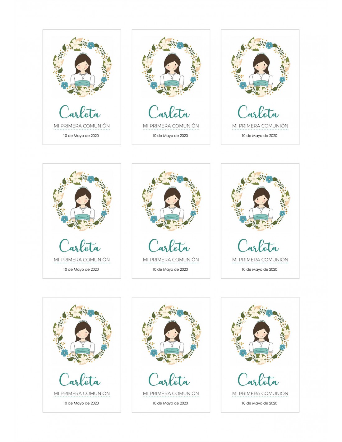 Hoja de papel de azúcar o chocotransfer impresa con tinta comestible con una bonita y elegante corona floral en el diseño, para decorar galletas de comunión, y personalizada con nombre y fecha.