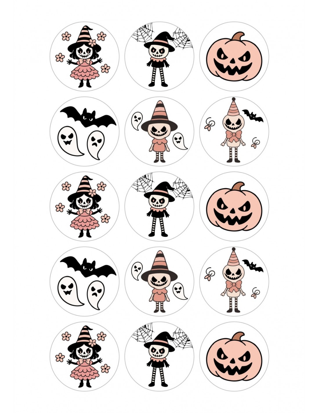 Incluye 15 círculos comestibles de 5 cm, perfectos para decorar galletas, cupcakes, donuts o mini tartas. Cada dibujo —brujitas, calabazas sonrientes, fantasmitas y murciélagos— está impreso con tintas comestibles de alta calidad, garantizando colores intensos, definidos y totalmente seguros para el consumo.