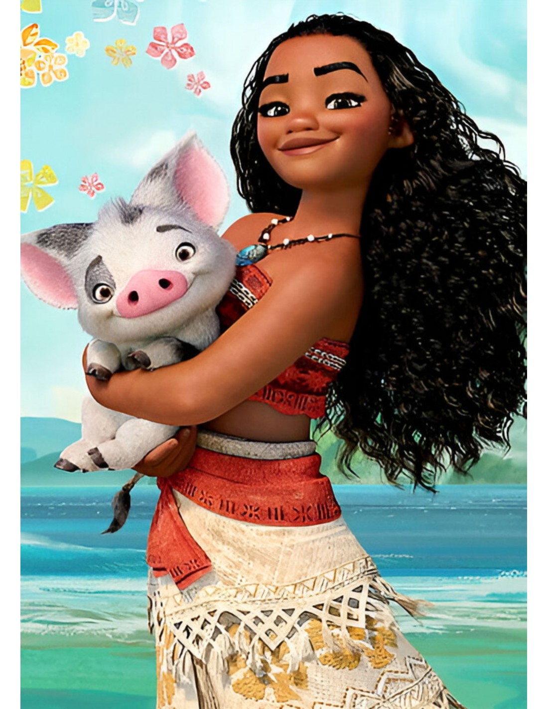 Hoja de papel de azúcar o chocotransfer impresa con tinta comestible para decorar tartas con los personajes de Vaiana.