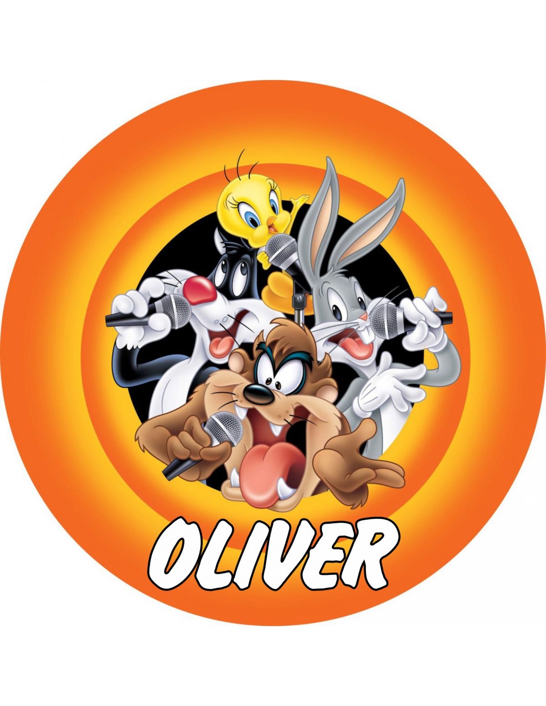 Hoja de papel de azúcar o chocotransfer impresa con tinta comestible para decorar tartas con los personajes de los Looney Tunes personalizado con nombre.
