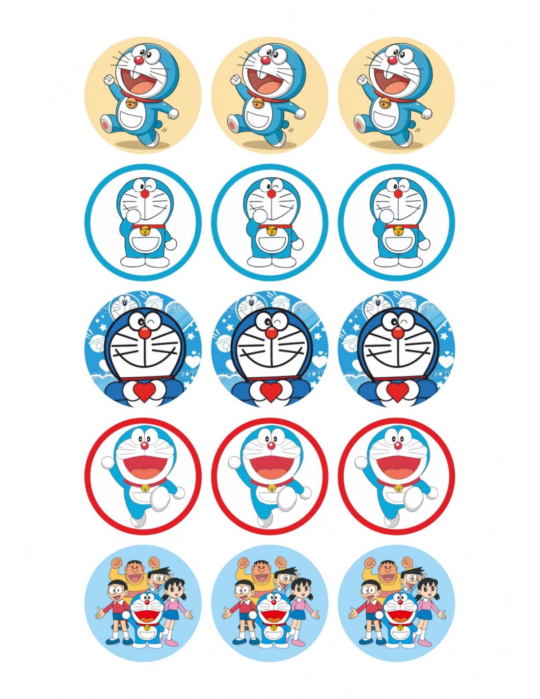 Hoja de papel de azúcar o chocotransfer impresa con tinta comestible para decorar cupcakes o galletas con los personajes de Doraemon.