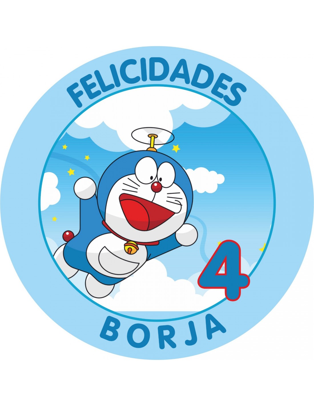 Hoja de papel de azúcar o chocotransfer impresa con tinta comestible para decorar tartas con los personajes de Doraemon personalizado con nombre y edad.