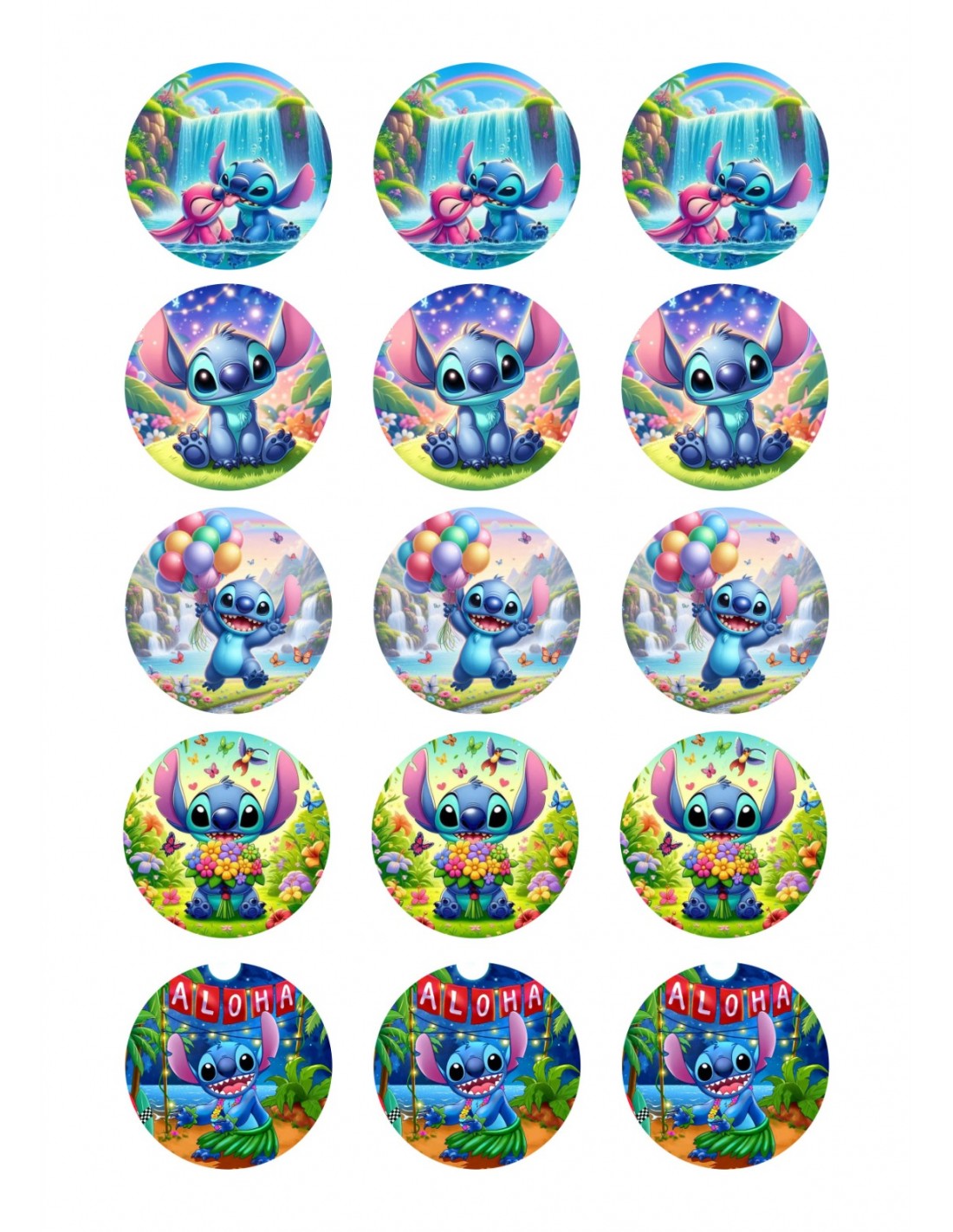 Hoja de papel comestible o chocotransfer impresa con tinta comestible para decorar galletas o cupcakes con imágenes de Stitch.