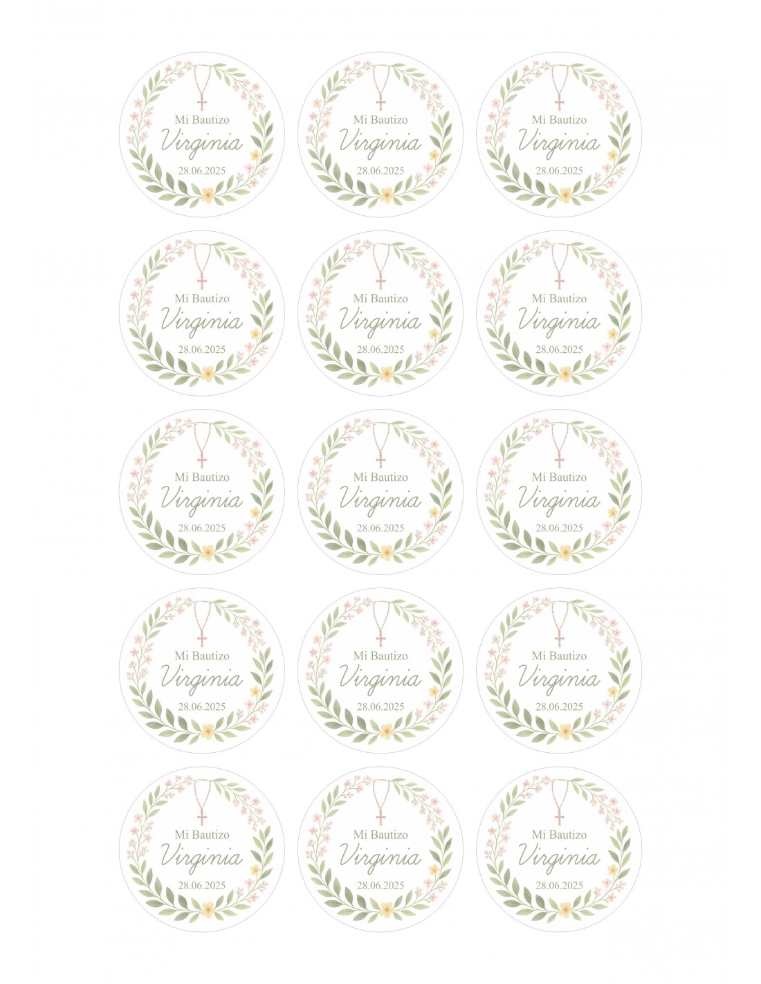 Celebra el bautizo de tu peque con un toque elegante y 100% personalizado. Este papel de azúcar para galletas está diseñado con una preciosa corona floral en tonos pastel, con un delicado rosario rosa y la inscripción "Mi Bautizo + Nombre + Fecha". Un diseño armonioso, tierno y muy especial que dará un aire distinguido a tus dulces. Ideal para galletas redondas, ¡y además comestible!