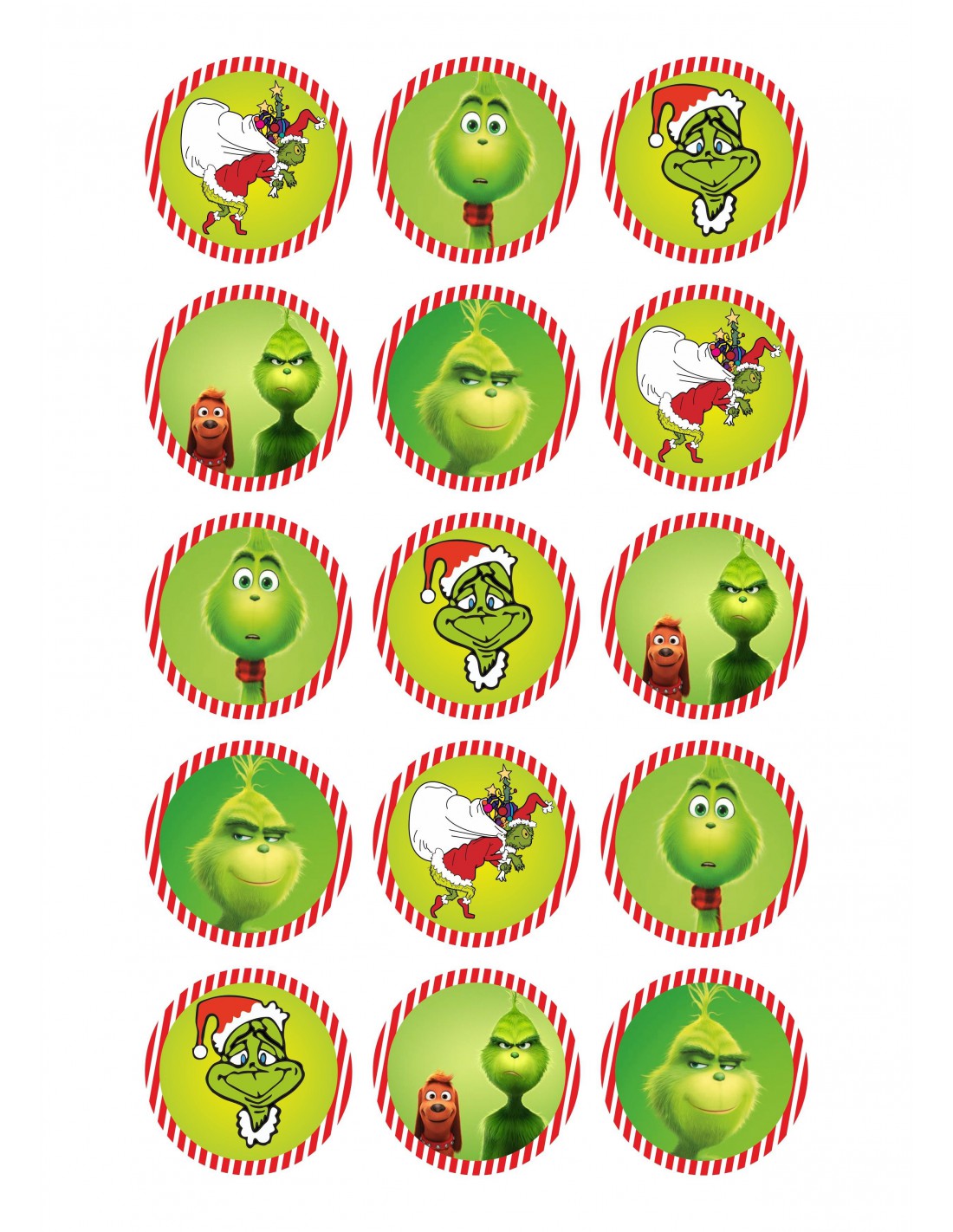 Hoja de papel de azúcar o chocotransfer impresa con tinta comestible para decorar galletas con divertidos dibujos de El Grinch en Navidad.