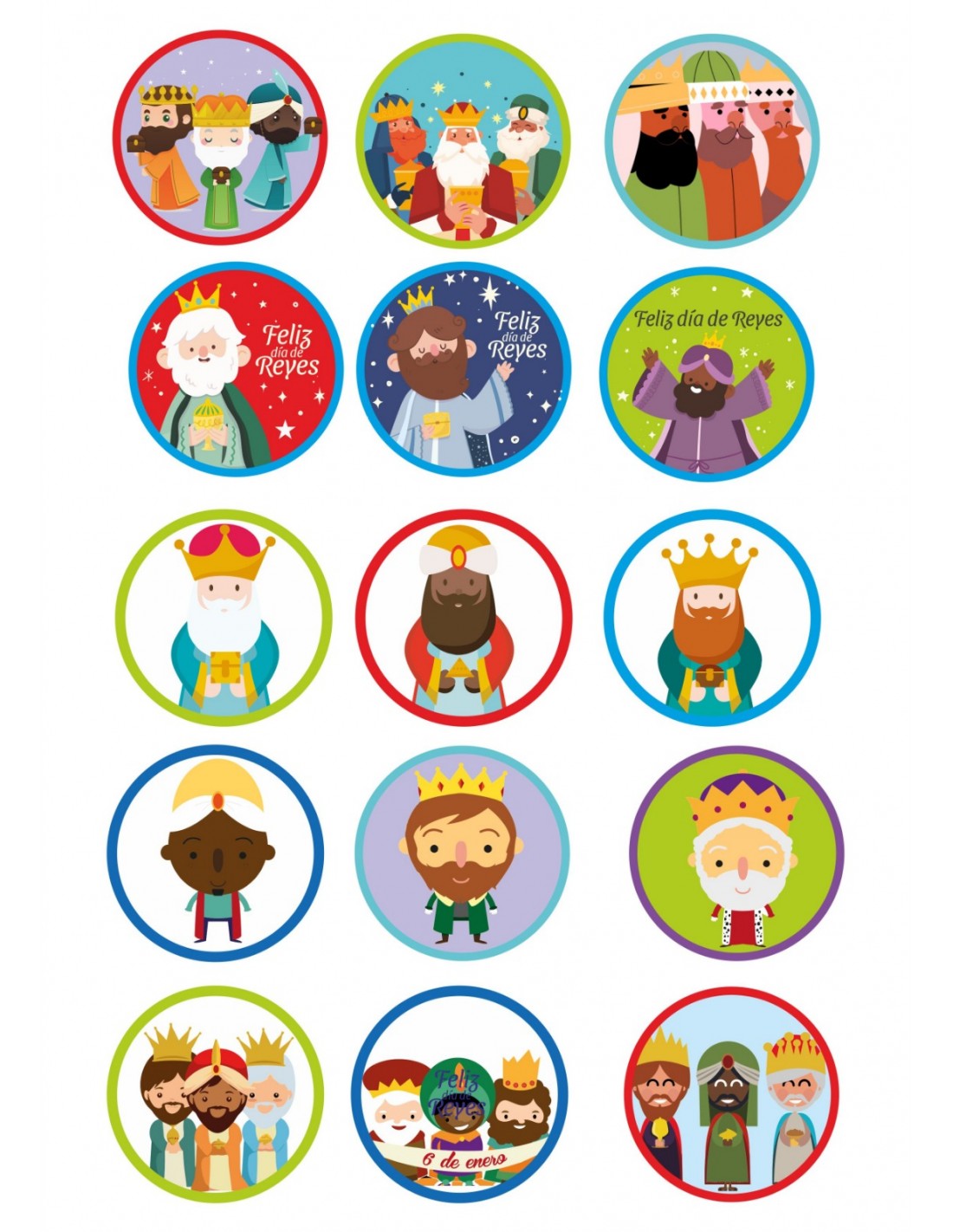 Hoja de papel de azúcar o chocotransfer impresa con tinta comestible para decorar galletas con divertidas imágenes de Reyes Magos.