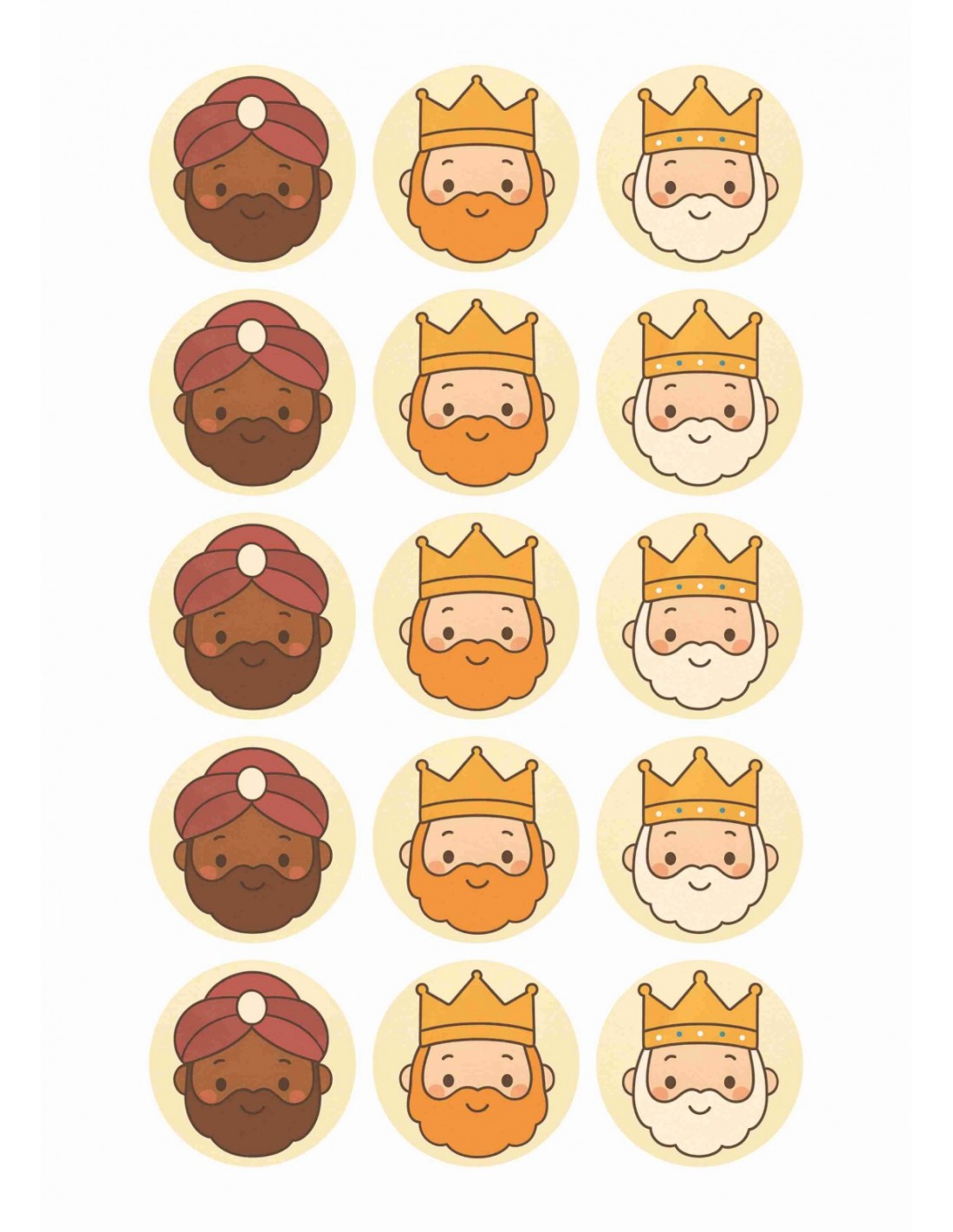 Hoja de papel de azúcar o chocotransfer impresa con tinta comestible para decorar galletas con divertidas imágenes de Reyes Magos.