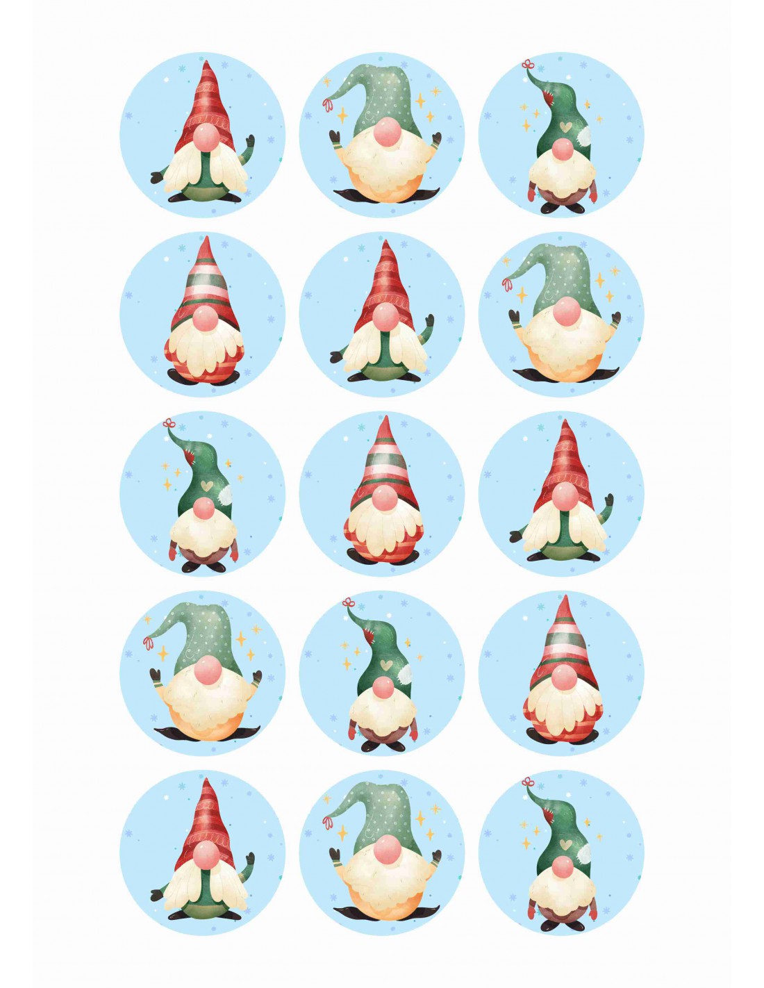 Hoja de papel de azúcar o chocotransfer impresa con tinta comestible para decorar galletas con divertidas imágenes Gnomos Navidad.