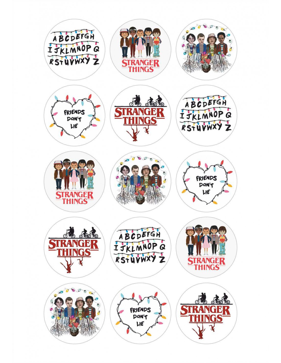 Hoja de papel de azúcar o chocotransfer, impresa con tinta comestible para decorar galletas o cupcakes con diferentes imágenes de la serie de Netflix Stranger Things.