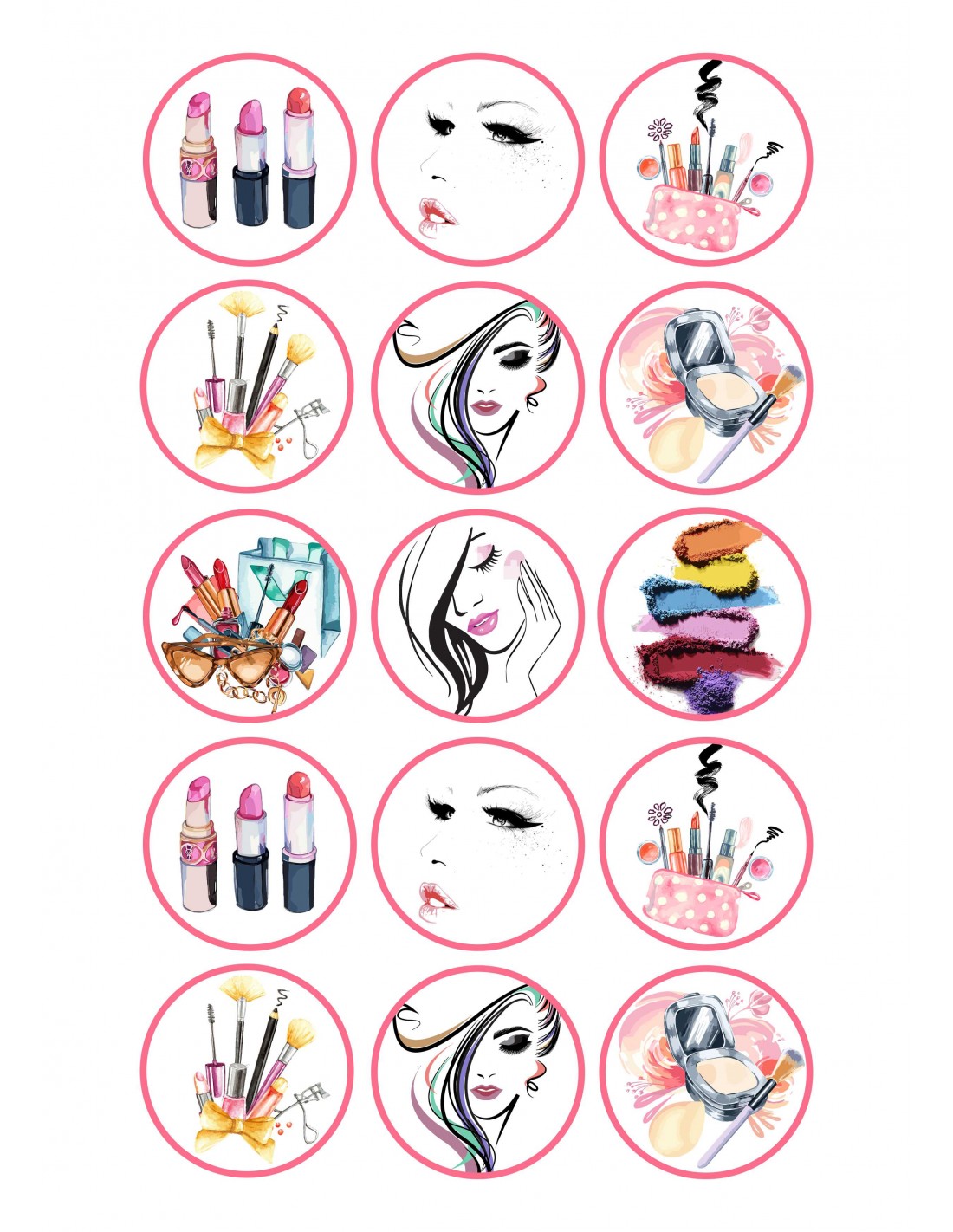 Hoja de papel de azúcar o chocotransfer impresa con tinta comestible para decorar galletas o cupcakes con imágenes de Maquillaje.