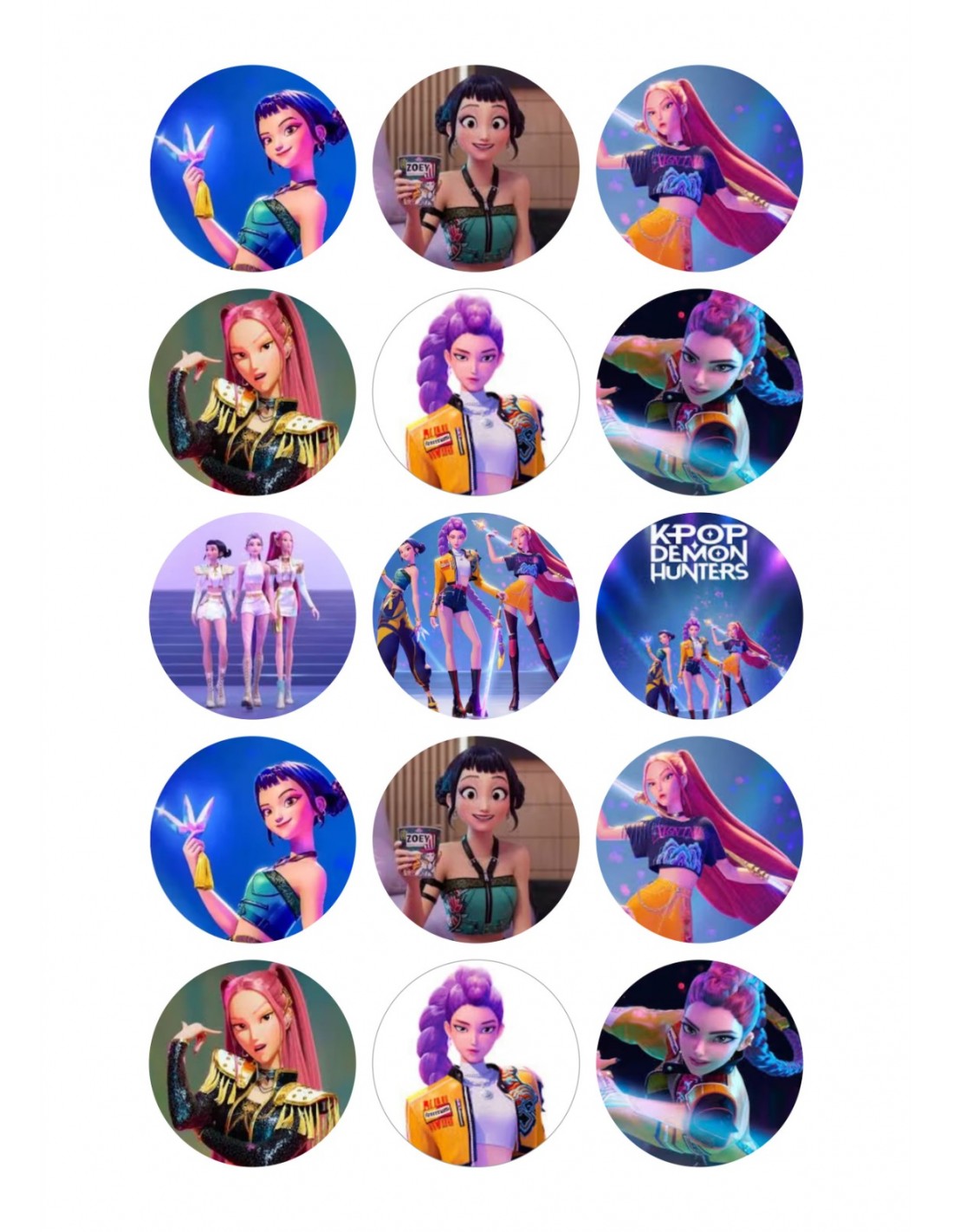 Hoja de papel comestible o chocotransfer impresa con tinta comestible para decorar galletas o cupcakes con imágenes de K-Pop Demon Hunters.