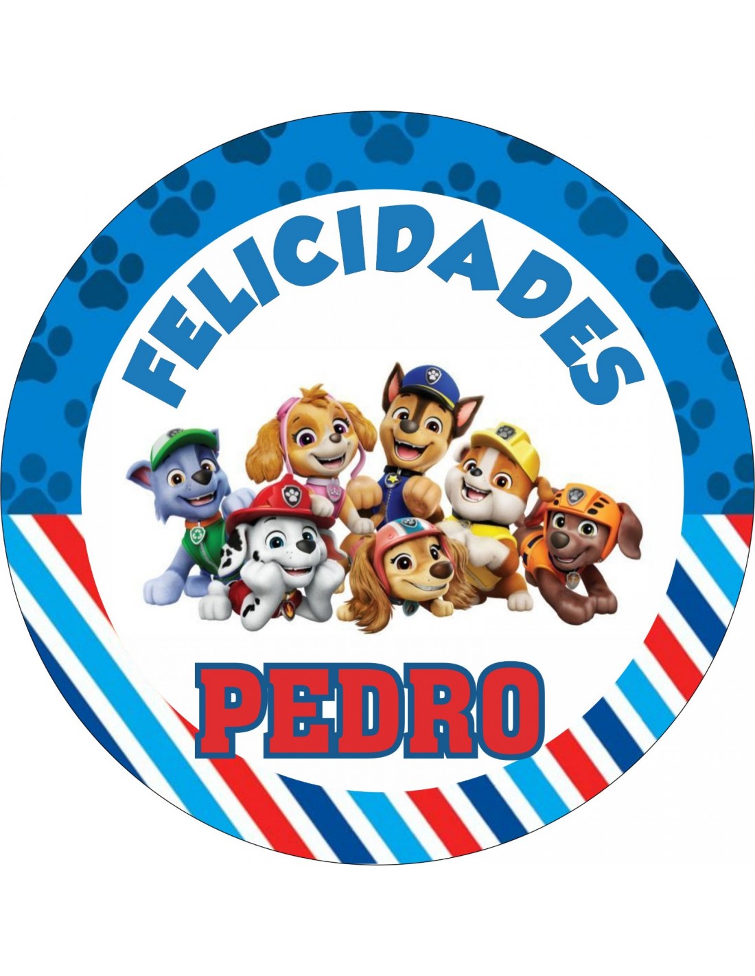Hoja de papel de azúcar o chocotransfer para personalizar tartas con temática de la Patrulla Canina, personalizado con el nombre que nos indiques, impresa con colorantes alimentarios.