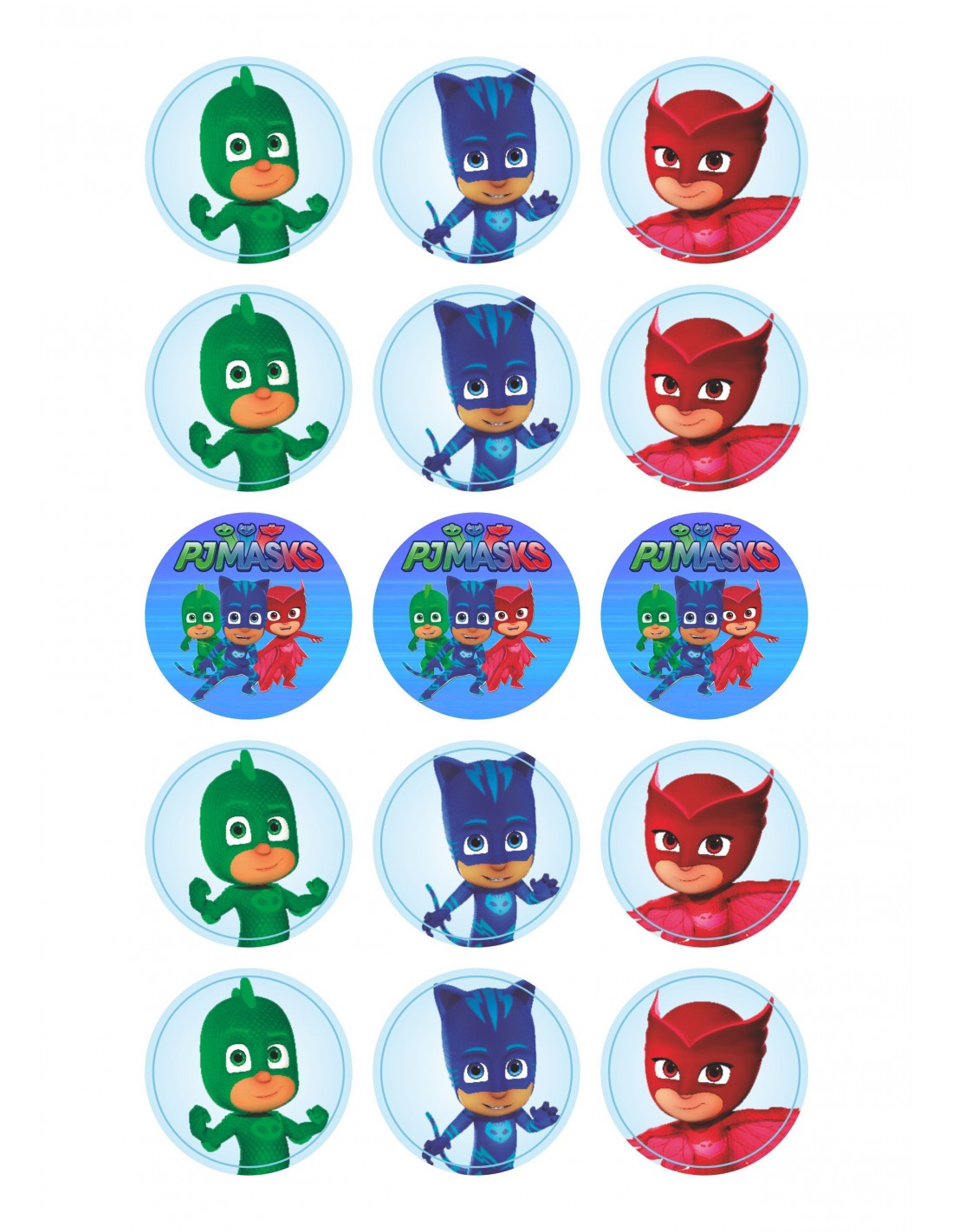 Hoja de papel de azúcar o chocotransfer impresa con tinta comestible para decorar galletas con imágenes de PJ Masks para galletas.