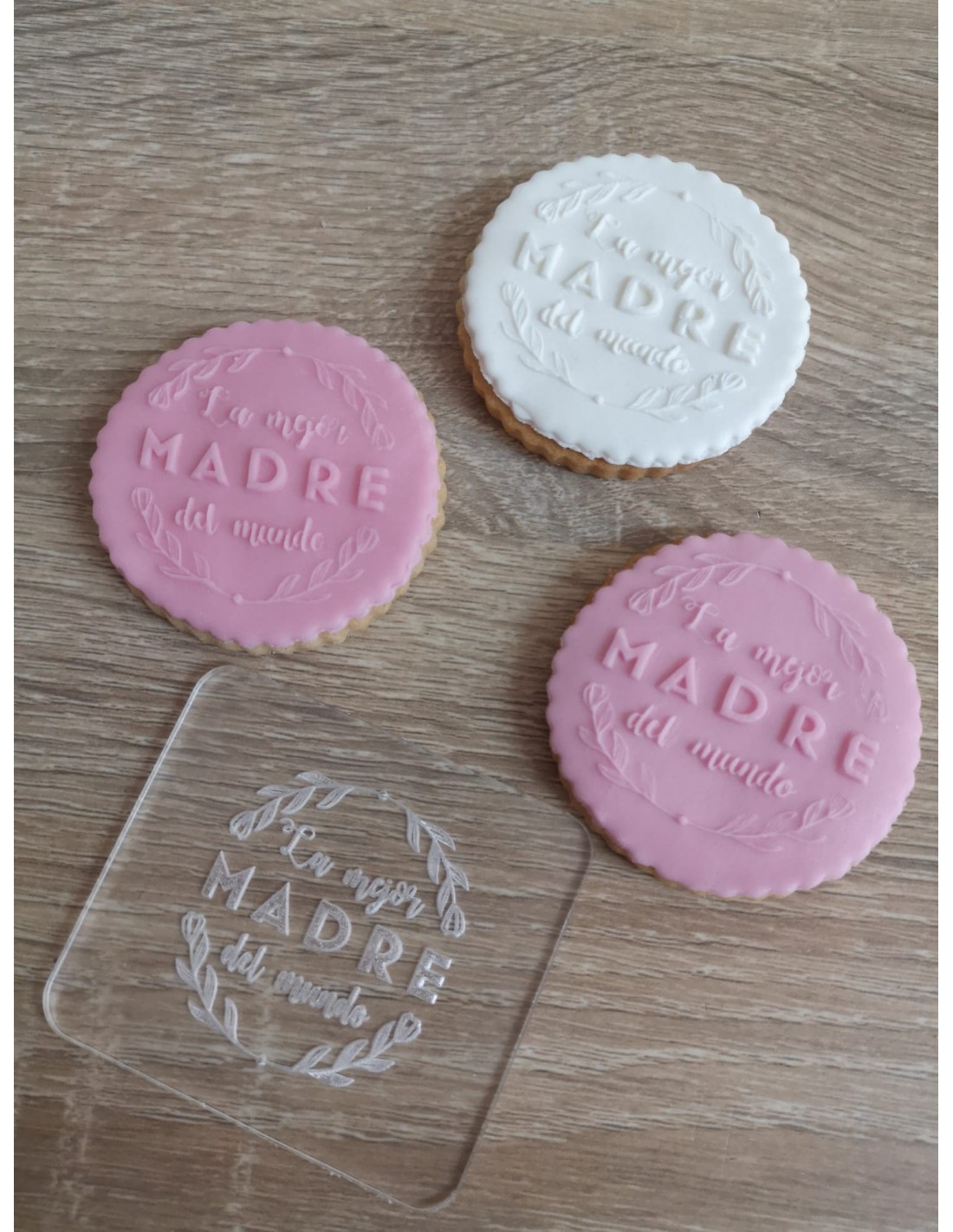 Sello para galletas con mensaje ideal para el día de la madre. Este sello está fabricado en metacrilato transparente apto para alimentación.