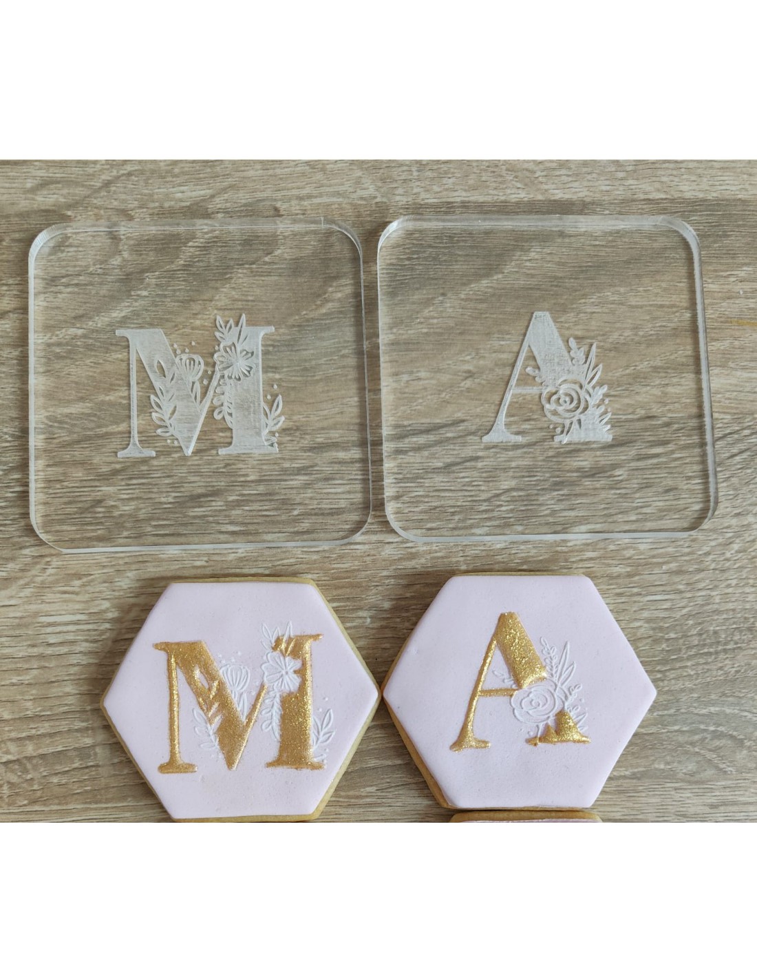 Sello Inicial Flores para galletas. Este sello está fabricado en metacrilato transparente apto para alimentación.