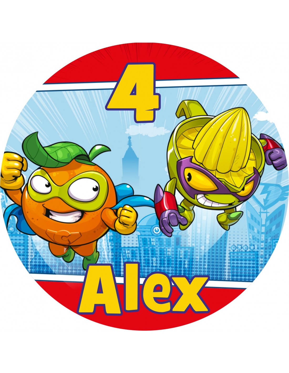 Hoja de papel de azúcar o chocotransfer, impresa con tinta comestible para decorar tartas con diferentes imágenes de los personajes de Superzings, personalizada con nombre.