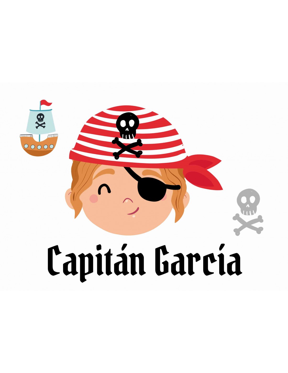 Hoja de papel de azúcar o chocotransfer impresa con tinta comestible para decorar tartas de temática Pirata y con el nombre personalizado.