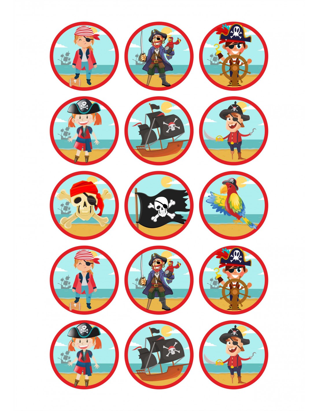 Hoja de papel de azúcar o chocotransfer impresa con tinta comestible para decorar galletas o cupcakes, con temática Pirata.