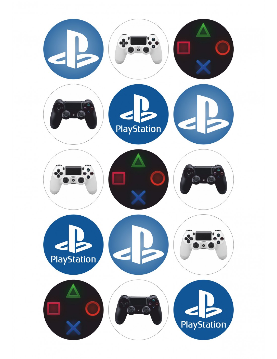 Hoja de papel de azúcar o chocotransfer impresa con tinta comestible para decorar galletas o cupcakes con temática inspirada en el logotipo de la Play Station PS4 y los botones del mando. Con este papel de azúcar PS4 podrás decorar tus elaboraciones de forma muy sencilla y con unos excelentes resultados.